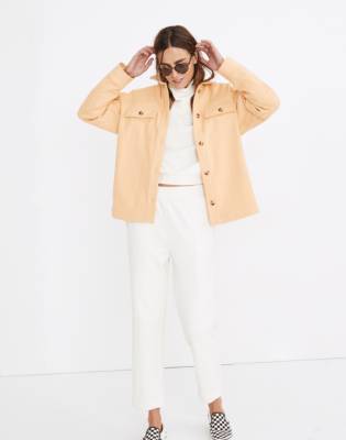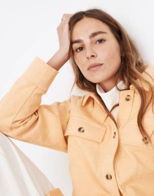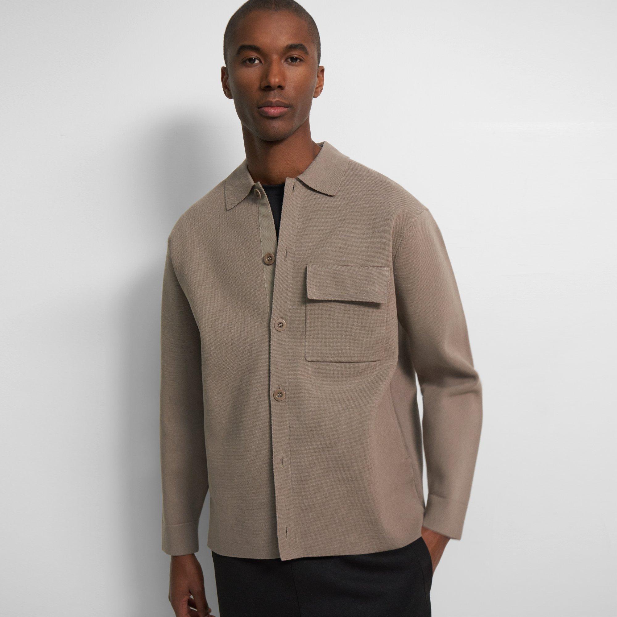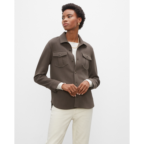 Shirt collar snap placket flap chest pockets long adjustable button cuff sleeves and rounded hem. The infamous shirt jacket style we all know and love this time in a stretchy knit material. Knit Shirt Jacket Color. The Wilfred Free Ronnie Shirt Jacket is a long knit shirt jacket. This item is now in your Favorites Sign In to save your Favorites Close Favorites. 72 Cotton 23 Polyester 5 Spandex. Free Shipping and Free Returns available or buy online and pick up in store. Body length from high point of shoulder. Barrie subverts a classic denim jacket in soft-handled navy cashmere blended with cotton.
